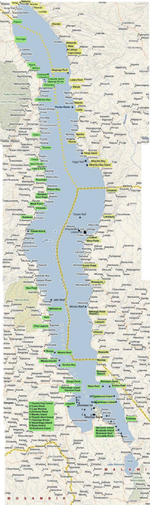 Der Malawisee ist mit einer Länge von ca. 580 km und einer Breite von ca. 75 km der drittgrößte See Afrikas und der neuntgrößte Binnensee der Welt (Fläche ca. 32.000 km²). Der Malawisee grenzt an die